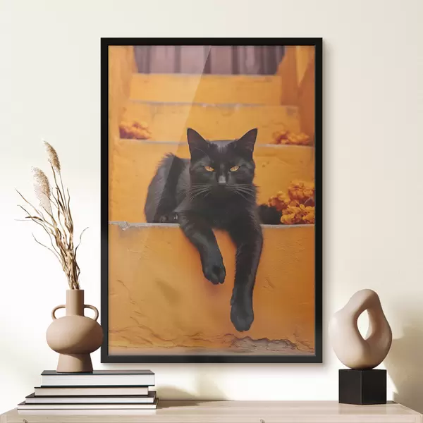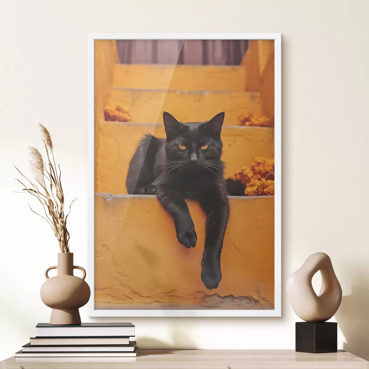 Poster Eine schwarze Katze liegt auf gelben Stufen Nr f40798