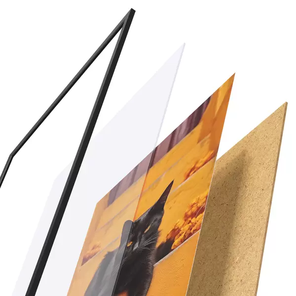 Das Poster besteht aus einem Rahmen, Plexiglas, einem gedruckten Bild und einer Rückwand aus Spanplatten. Dank der Halterungen auf der Rückseite kann das Poster sofort an die Wand gehängt werden.