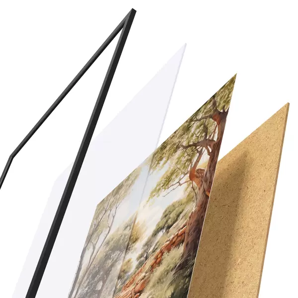 Das Poster besteht aus einem Rahmen, Plexiglas, einem gedruckten Bild und einer Rückwand aus Spanplatten. Dank der Halterungen auf der Rückseite kann das Poster sofort an die Wand gehängt werden.