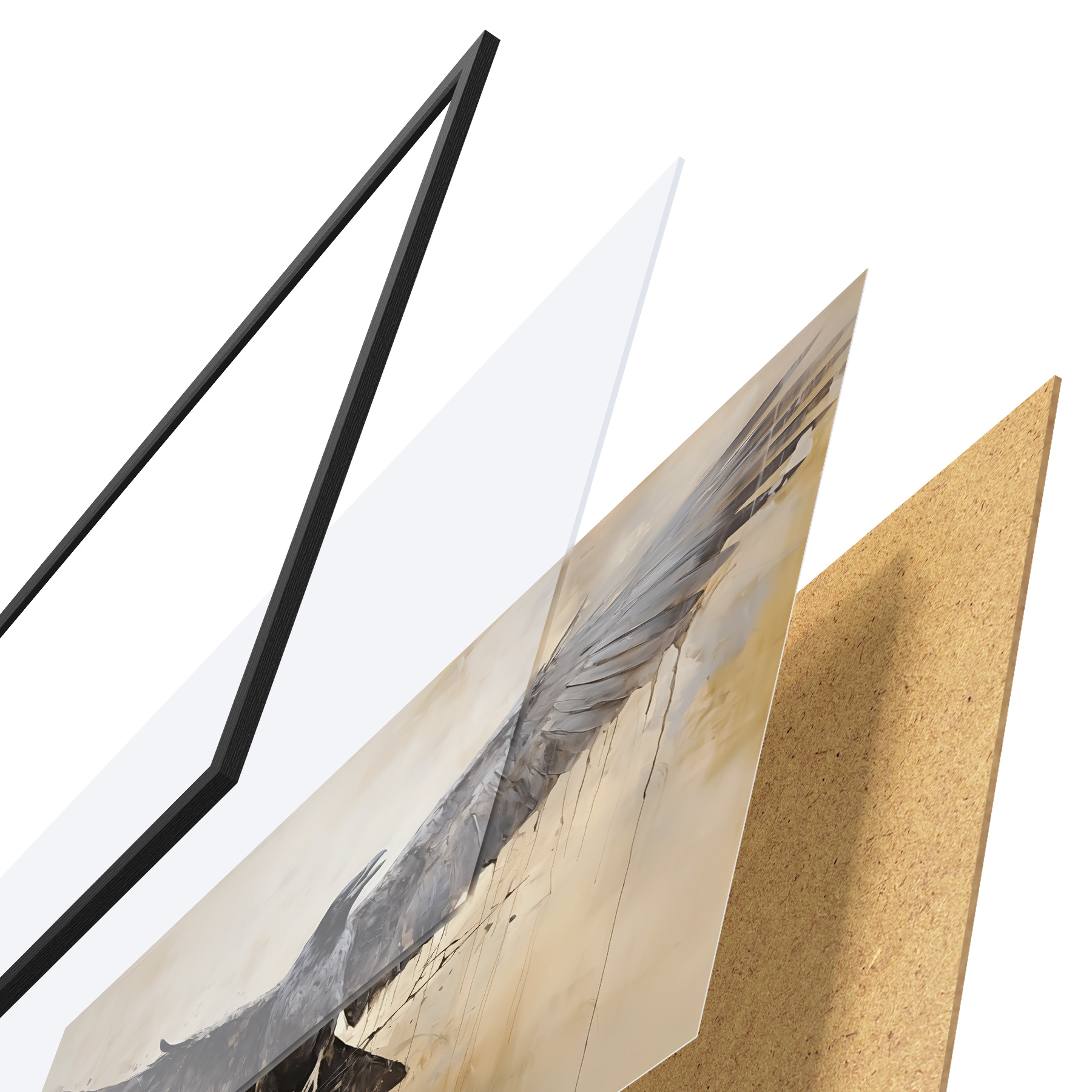 Das Poster besteht aus einem Rahmen, Plexiglas, einem gedruckten Bild und einer Rückwand aus Spanplatten. Dank der Halterungen auf der Rückseite kann das Poster sofort an die Wand gehängt werden.