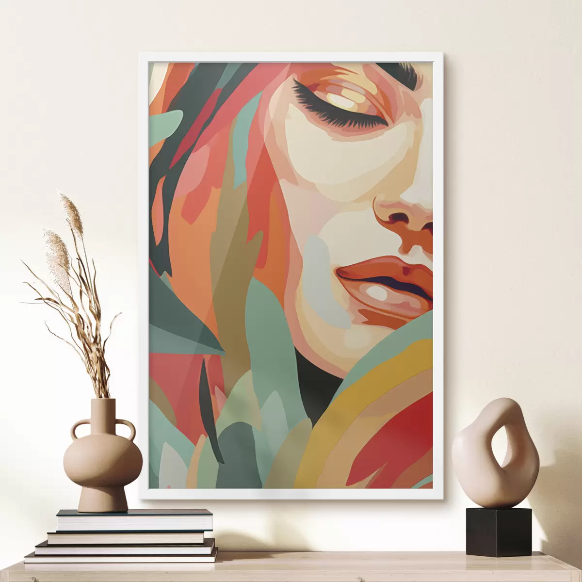 Poster Schöne Frau Gesicht, geometrische Abstraktion, floral, Acrylzeichnung Nr f40815
