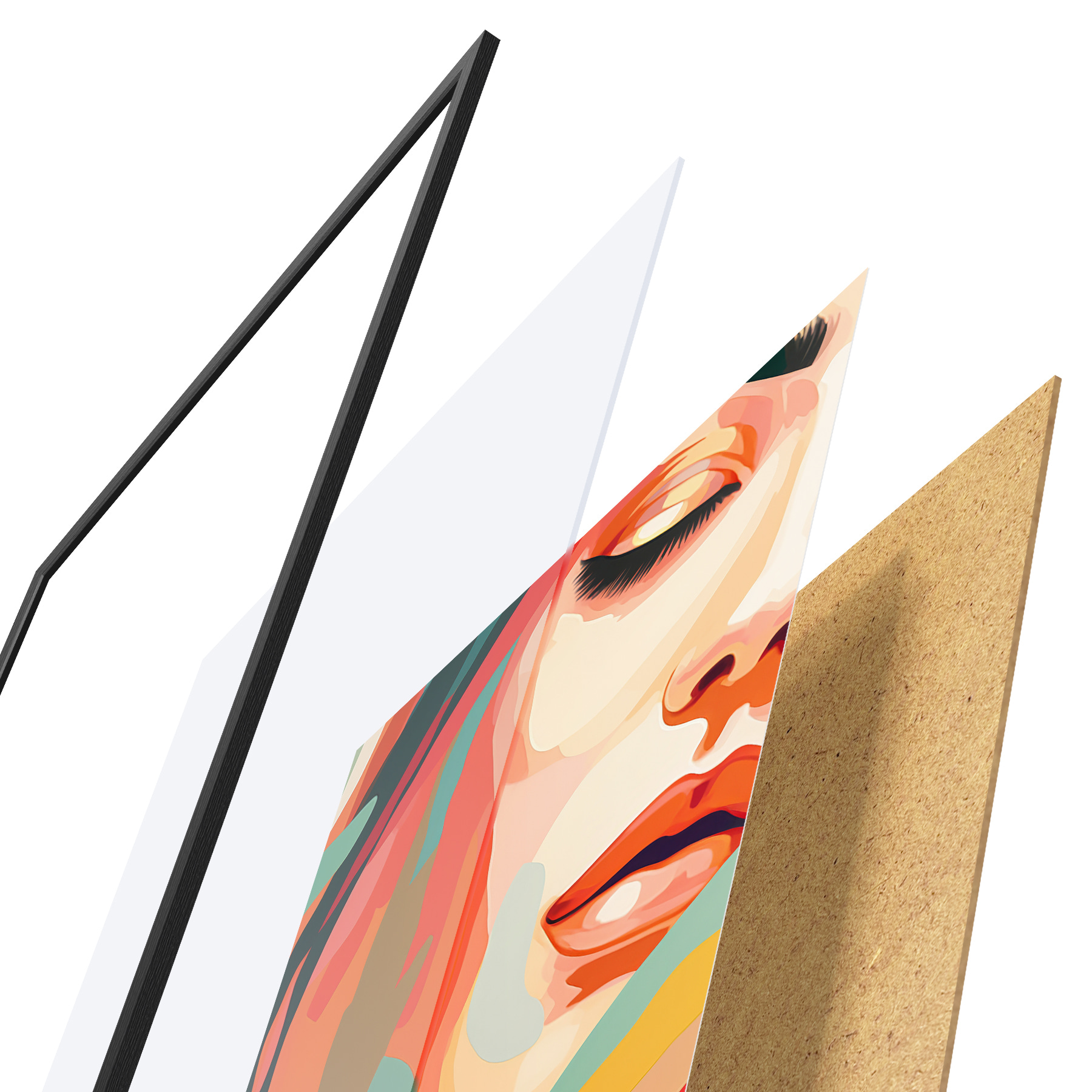 Das Poster besteht aus einem Rahmen, Plexiglas, einem gedruckten Bild und einer Rückwand aus Spanplatten. Dank der Halterungen auf der Rückseite kann das Poster sofort an die Wand gehängt werden.
