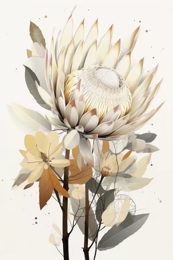 Poster Schöne Protea-Blüten mit üppigen Blättern, weiche Beigetöne, Baumwolle f40817