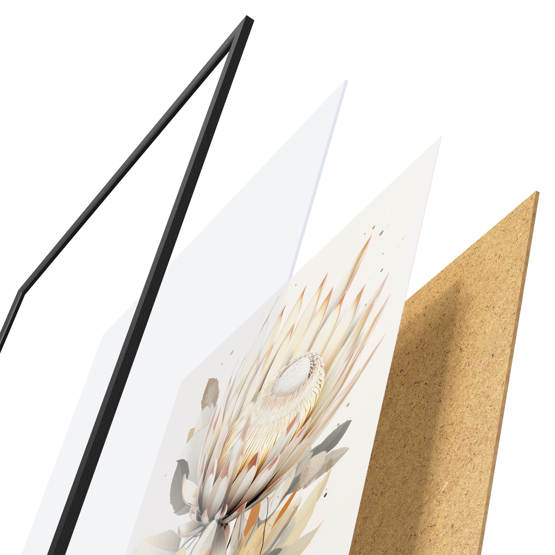 Das Poster besteht aus einem Rahmen, Plexiglas, einem gedruckten Bild und einer Rückwand aus Spanplatten. Dank der Halterungen auf der Rückseite kann das Poster sofort an die Wand gehängt werden.