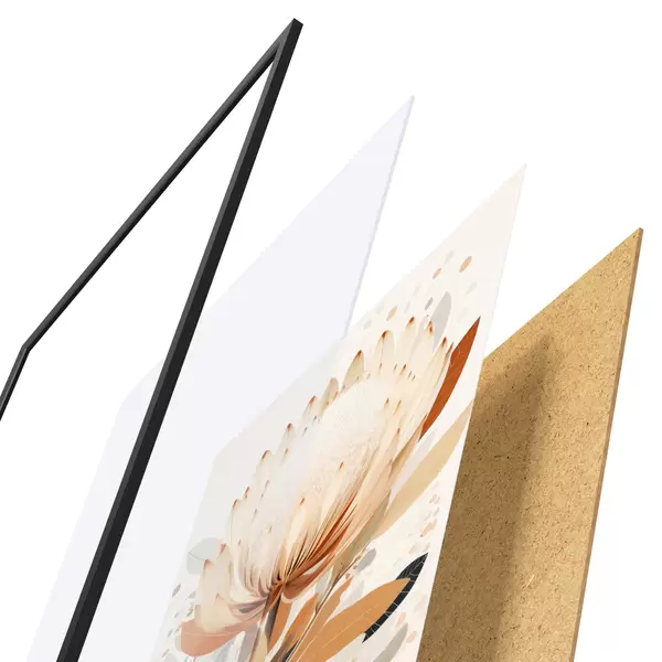 Das Poster besteht aus einem Rahmen, Plexiglas, einem gedruckten Bild und einer Rückwand aus Spanplatten. Dank der Halterungen auf der Rückseite kann das Poster sofort an die Wand gehängt werden.
