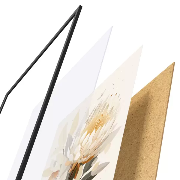 Das Poster besteht aus einem Rahmen, Plexiglas, einem gedruckten Bild und einer Rückwand aus Spanplatten. Dank der Halterungen auf der Rückseite kann das Poster sofort an die Wand gehängt werden.