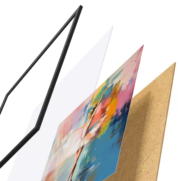 Das Poster besteht aus einem Rahmen, Plexiglas, einem gedruckten Bild und einer Rückwand aus Spanplatten. Dank der Halterungen auf der Rückseite kann das Poster sofort an die Wand gehängt werden.