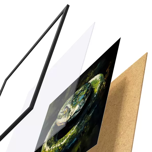 Das Poster besteht aus einem Rahmen, Plexiglas, einem gedruckten Bild und einer Rückwand aus Spanplatten. Dank der Halterungen auf der Rückseite kann das Poster sofort an die Wand gehängt werden.