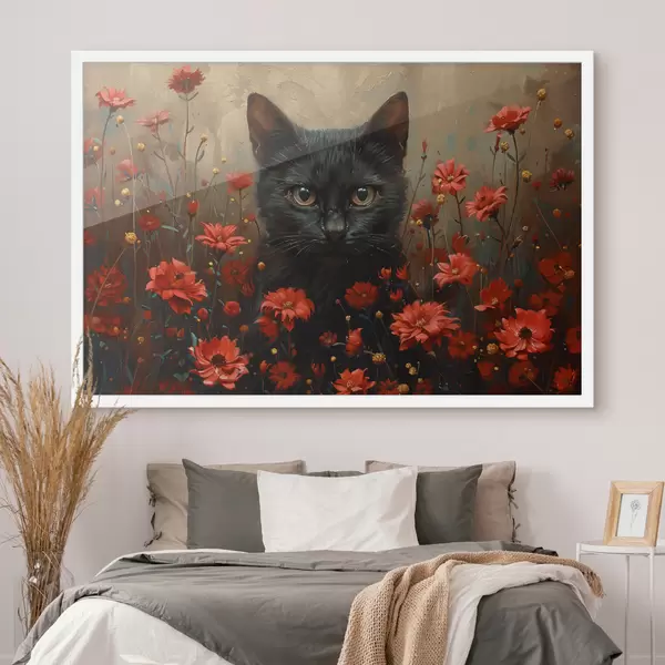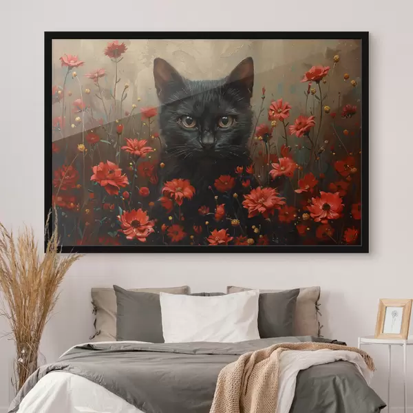 Poster Katze, Blumen, schwarze Katze f40839