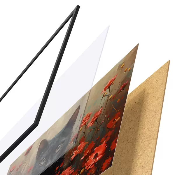 Das Poster besteht aus einem Rahmen, Plexiglas, einem gedruckten Bild und einer Rückwand aus Spanplatten. Dank der Halterungen auf der Rückseite kann das Poster sofort an die Wand gehängt werden.