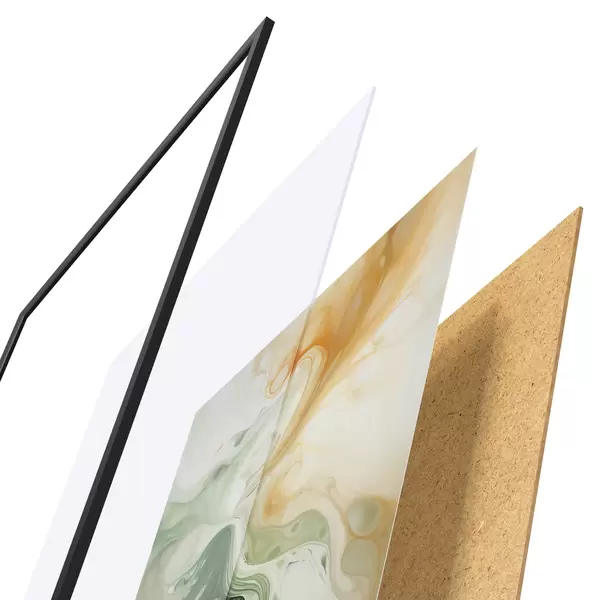 Das Poster besteht aus einem Rahmen, Plexiglas, einem gedruckten Bild und einer Rückwand aus Spanplatten. Dank der Halterungen auf der Rückseite kann das Poster sofort an die Wand gehängt werden.