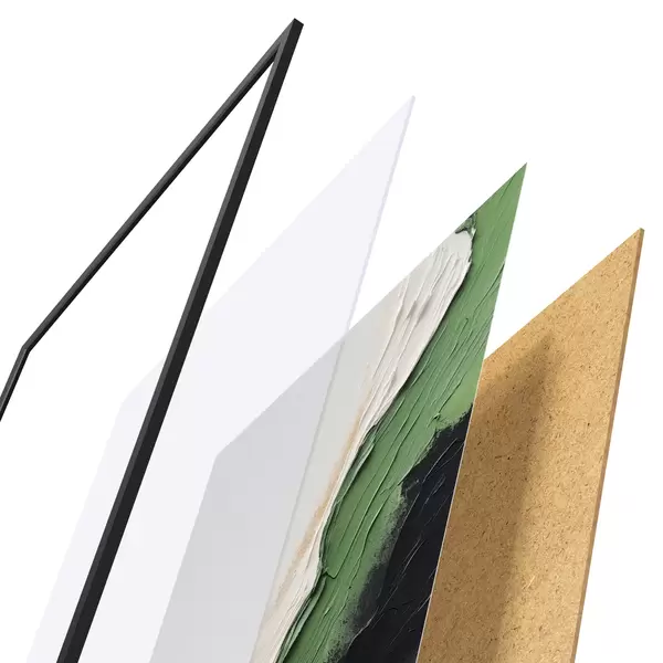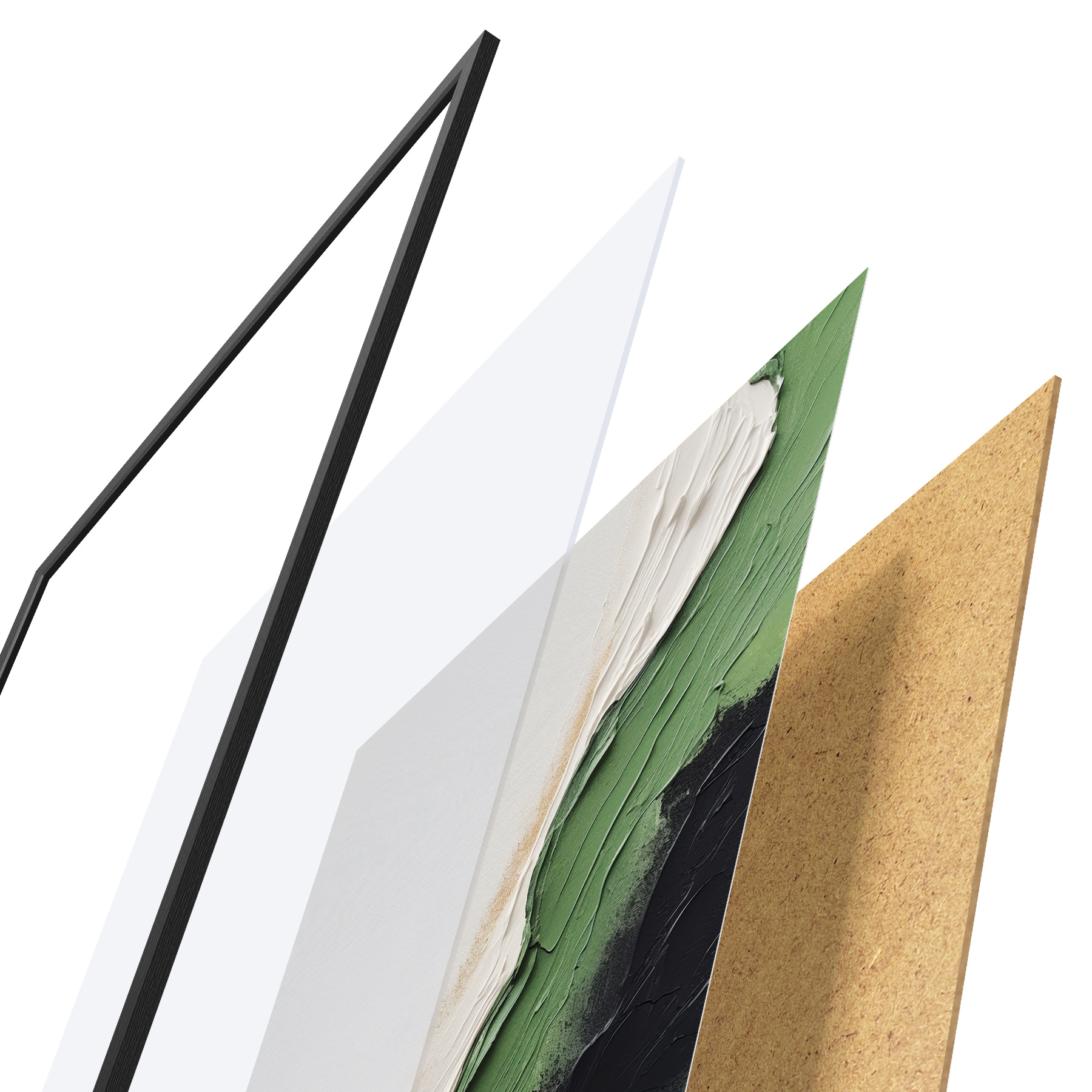 Das Poster besteht aus einem Rahmen, Plexiglas, einem gedruckten Bild und einer Rückwand aus Spanplatten. Dank der Halterungen auf der Rückseite kann das Poster sofort an die Wand gehängt werden.