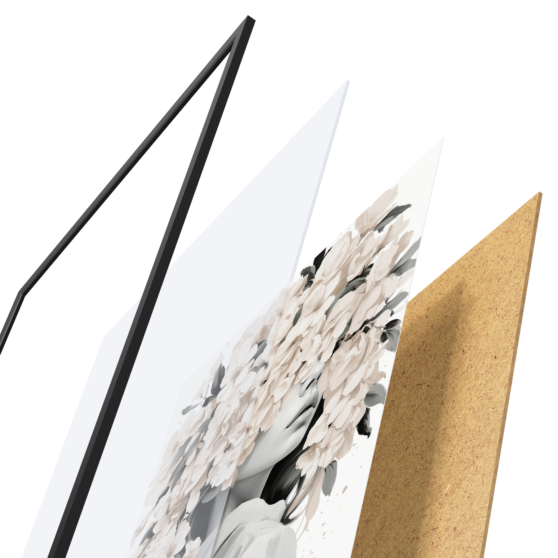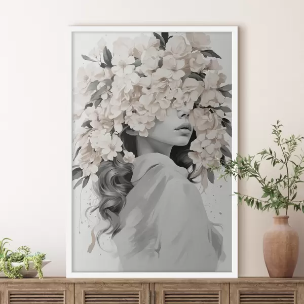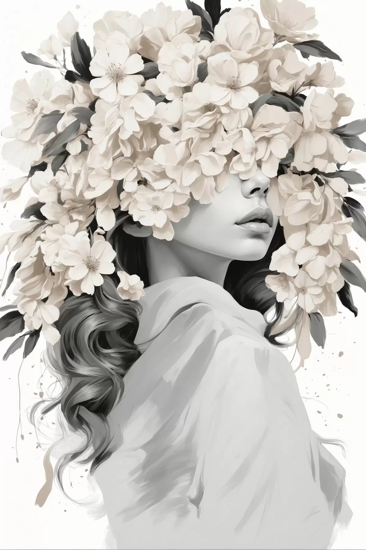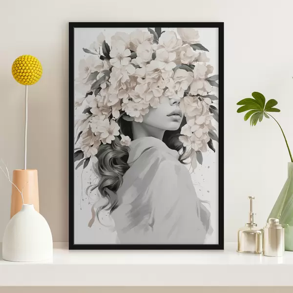 Poster Mädchen mit Blumen im Gesicht in schwarzen und weißen Farben Nr f40849