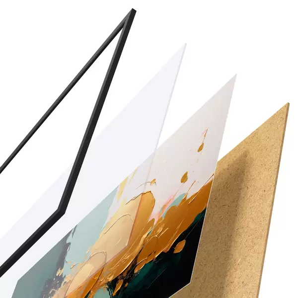 Das Poster besteht aus einem Rahmen, Plexiglas, einem gedruckten Bild und einer Rückwand aus Spanplatten. Dank der Halterungen auf der Rückseite kann das Poster sofort an die Wand gehängt werden.