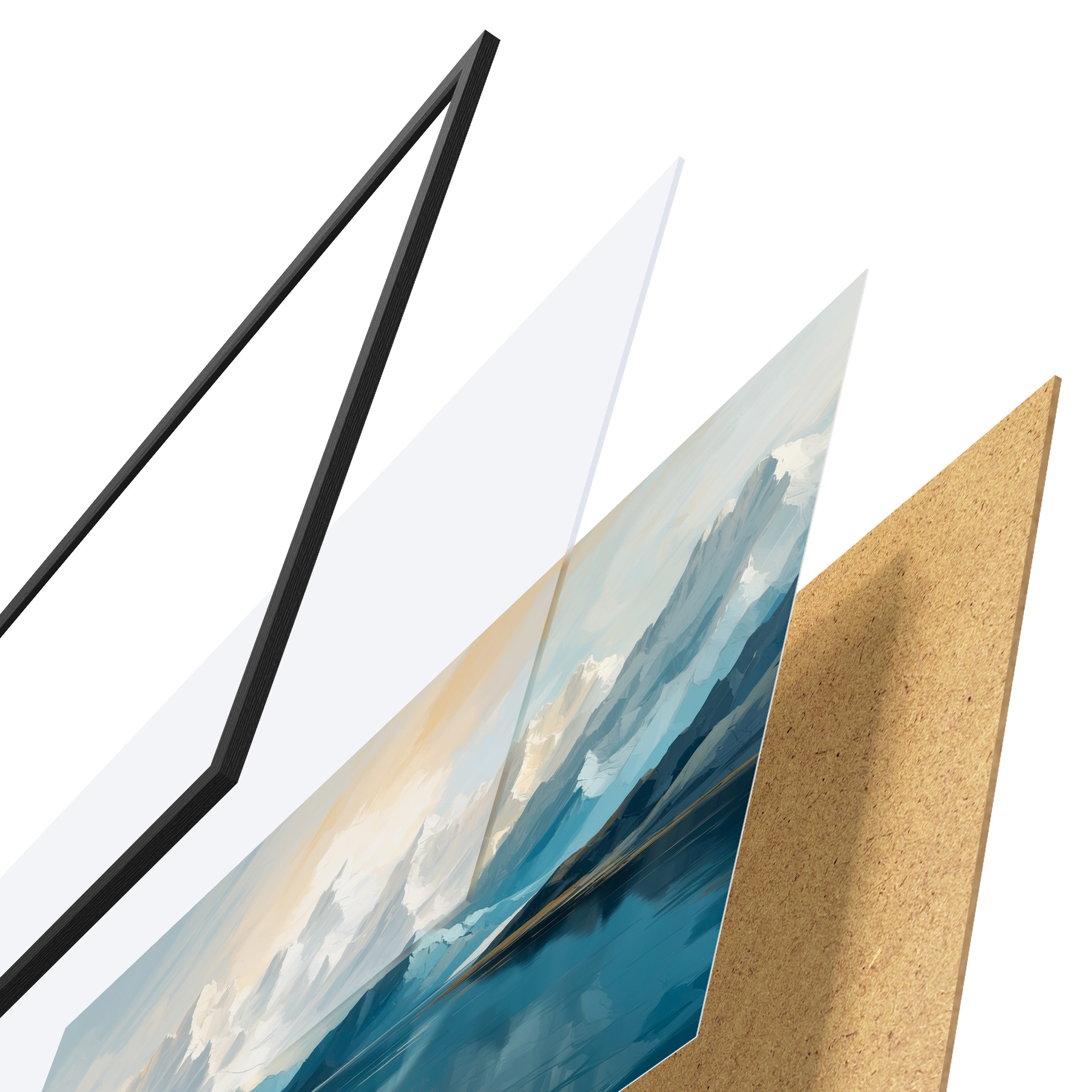 Das Poster besteht aus einem Rahmen, Plexiglas, einem gedruckten Bild und einer Rückwand aus Spanplatten. Dank der Halterungen auf der Rückseite kann das Poster sofort an die Wand gehängt werden.