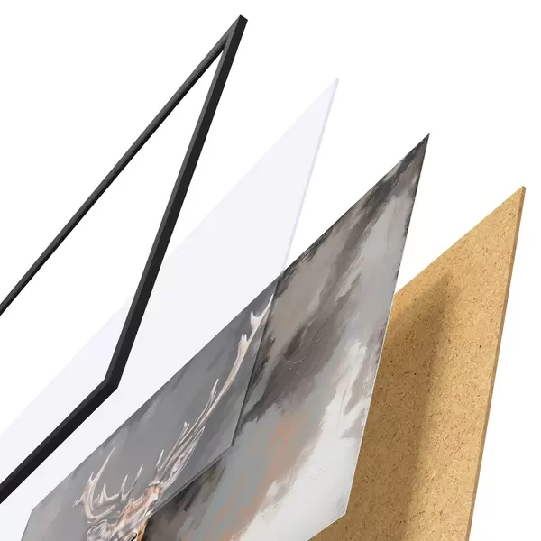 Das Poster besteht aus einem Rahmen, Plexiglas, einem gedruckten Bild und einer Rückwand aus Spanplatten. Dank der Halterungen auf der Rückseite kann das Poster sofort an die Wand gehängt werden.
