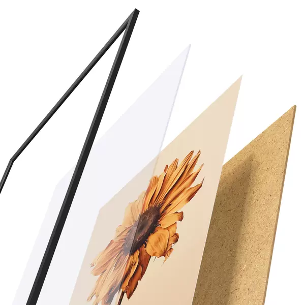 Das Poster besteht aus einem Rahmen, Plexiglas, einem gedruckten Bild und einer Rückwand aus Spanplatten. Dank der Halterungen auf der Rückseite kann das Poster sofort an die Wand gehängt werden.