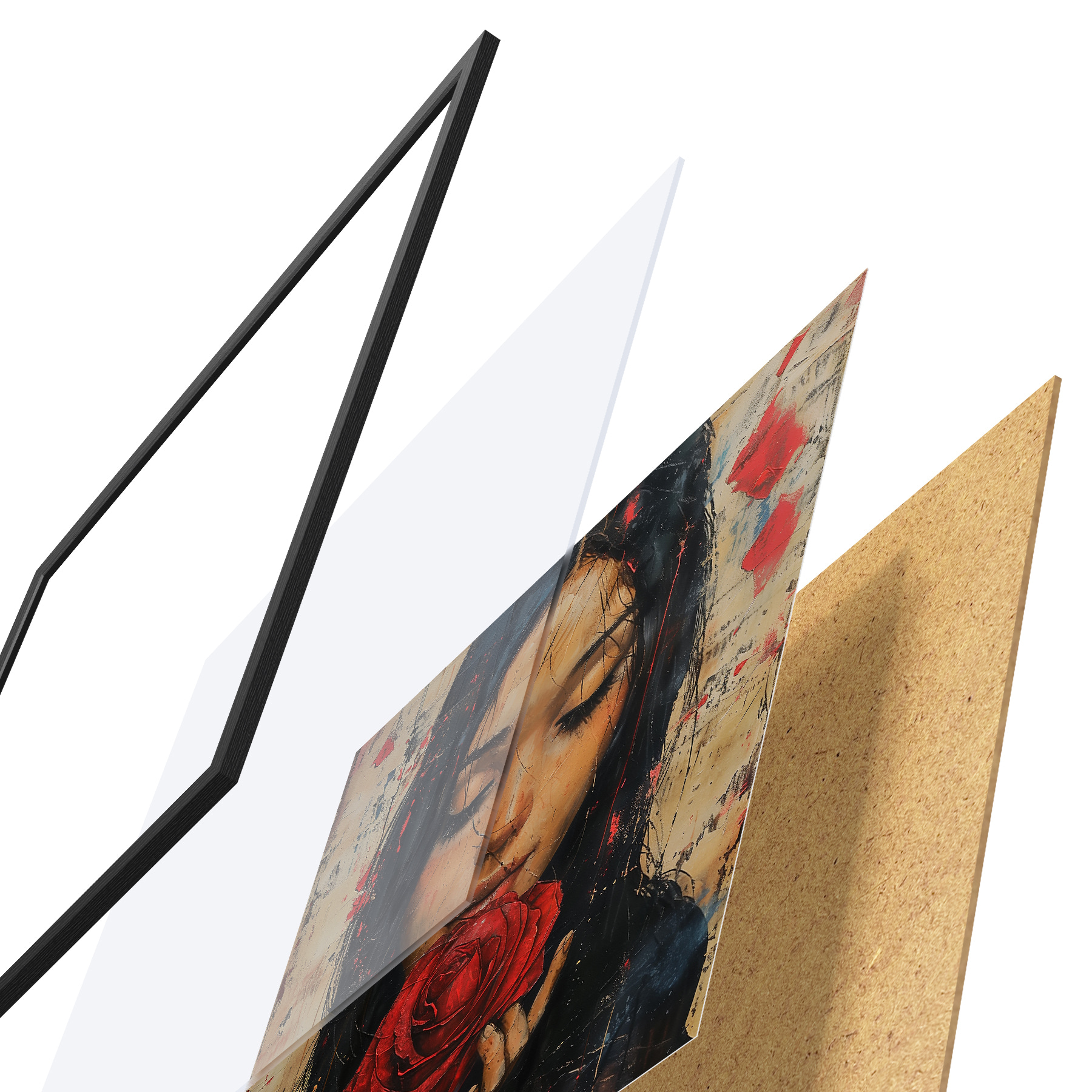 Das Poster besteht aus einem Rahmen, Plexiglas, einem gedruckten Bild und einer Rückwand aus Spanplatten. Dank der Halterungen auf der Rückseite kann das Poster sofort an die Wand gehängt werden.