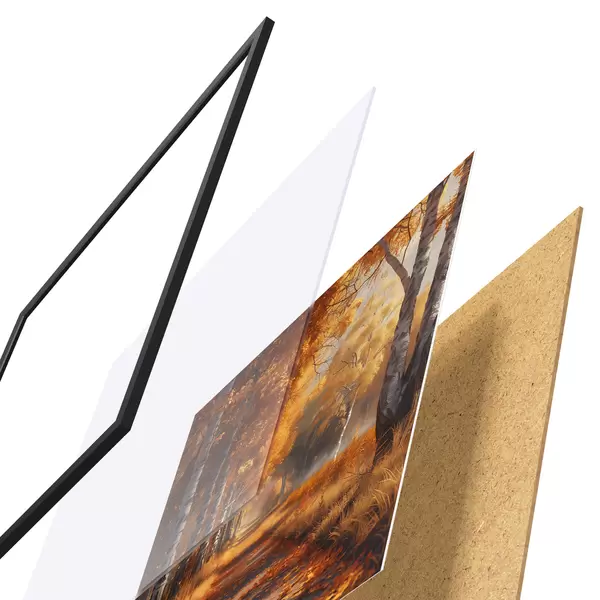 Das Poster besteht aus einem Rahmen, Plexiglas, einem gedruckten Bild und einer Rückwand aus Spanplatten. Dank der Halterungen auf der Rückseite kann das Poster sofort an die Wand gehängt werden.