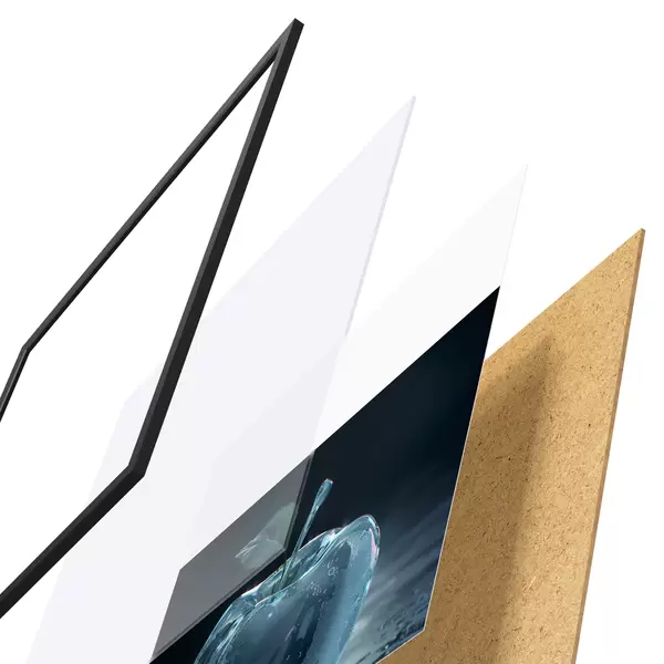 Das Poster besteht aus einem Rahmen, Plexiglas, einem gedruckten Bild und einer Rückwand aus Spanplatten. Dank der Halterungen auf der Rückseite kann das Poster sofort an die Wand gehängt werden.