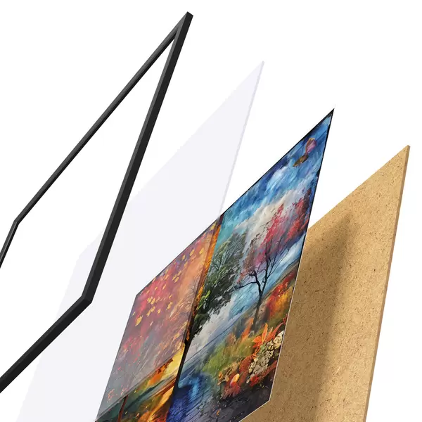 Das Poster besteht aus einem Rahmen, Plexiglas, einem gedruckten Bild und einer Rückwand aus Spanplatten. Dank der Halterungen auf der Rückseite kann das Poster sofort an die Wand gehängt werden.