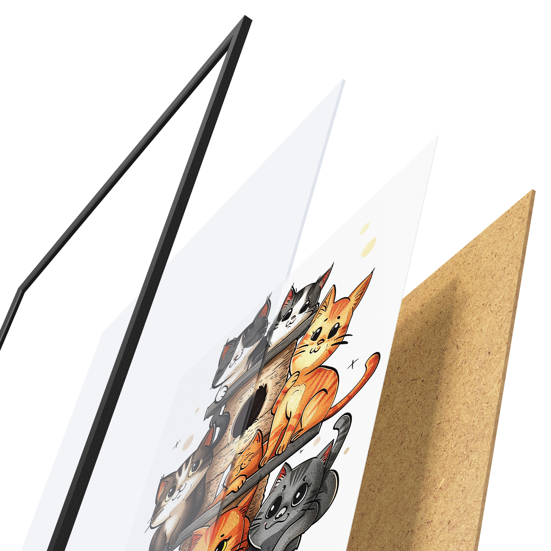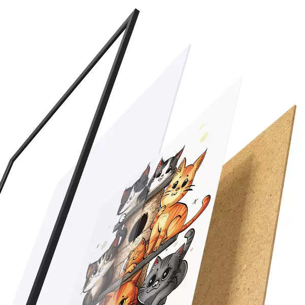 Das Poster besteht aus einem Rahmen, Plexiglas, einem gedruckten Bild und einer Rückwand aus Spanplatten. Dank der Halterungen auf der Rückseite kann das Poster sofort an die Wand gehängt werden.