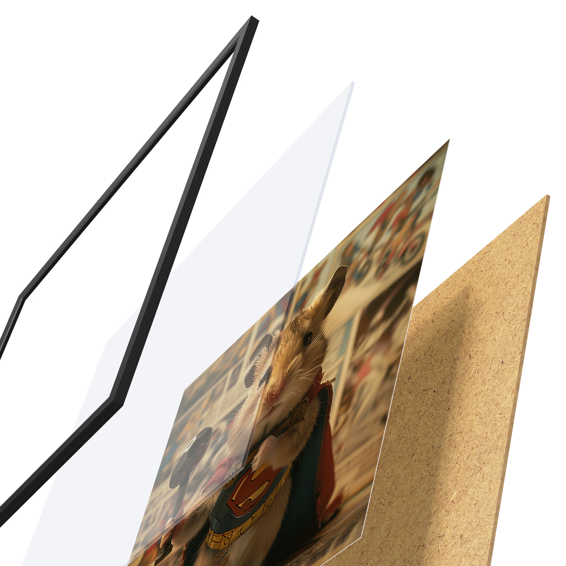 Das Poster besteht aus einem Rahmen, Plexiglas, einem gedruckten Bild und einer Rückwand aus Spanplatten. Dank der Halterungen auf der Rückseite kann das Poster sofort an die Wand gehängt werden.