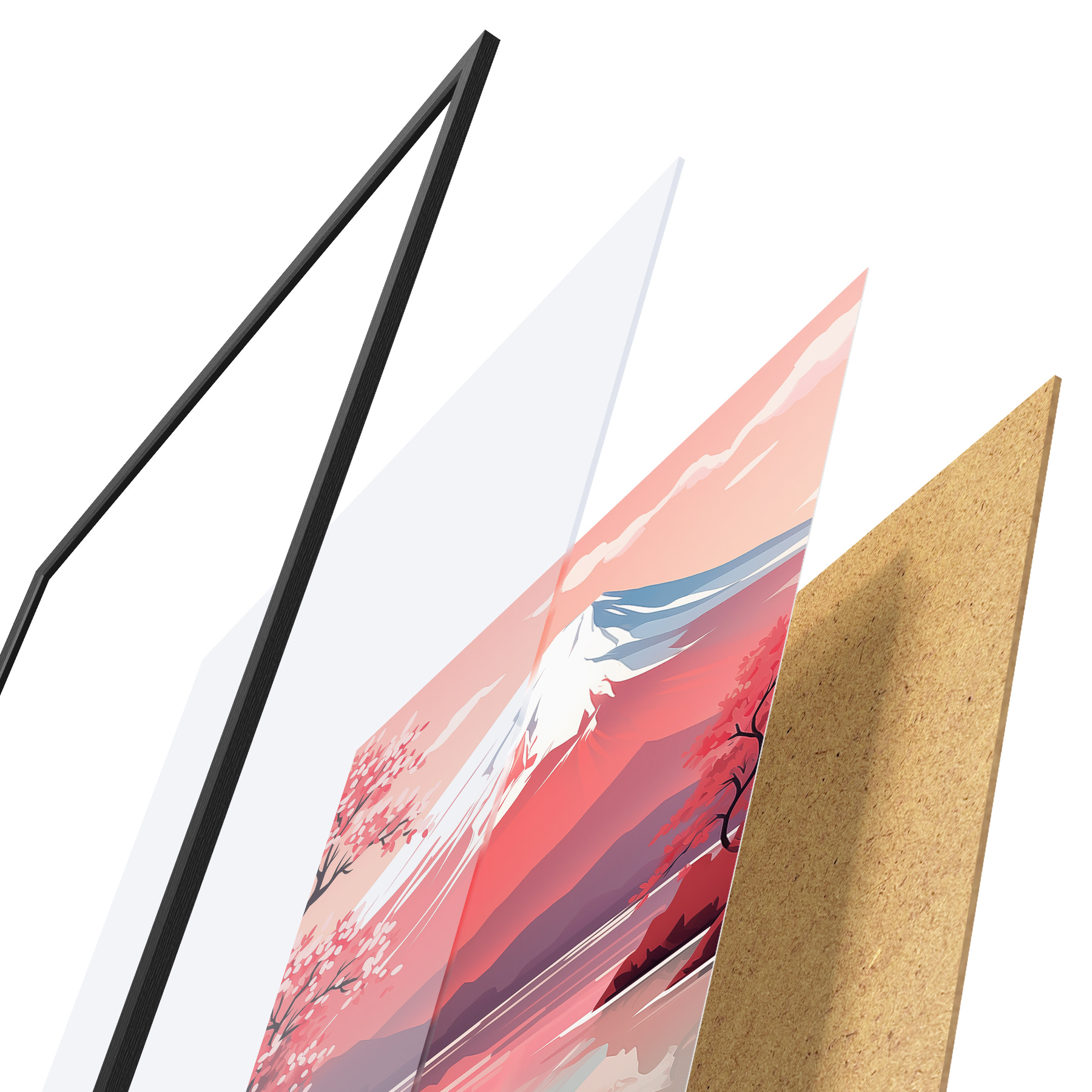 Das Poster besteht aus einem Rahmen, Plexiglas, einem gedruckten Bild und einer Rückwand aus Spanplatten. Dank der Halterungen auf der Rückseite kann das Poster sofort an die Wand gehängt werden.
