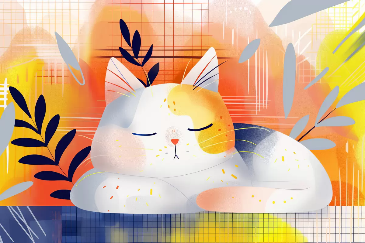 Poster Eine niedliche Katze, die zwischen Pflanzen schläft, in einem grafischen Stil f40956