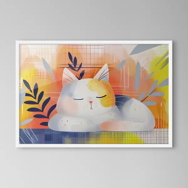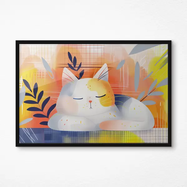 Poster Eine niedliche Katze, die zwischen Pflanzen schläft, in einem grafischen Stil Nr f40956