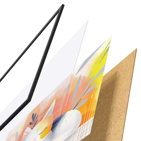 Das Poster besteht aus einem Rahmen, Plexiglas, einem gedruckten Bild und einer Rückwand aus Spanplatten. Dank der Halterungen auf der Rückseite kann das Poster sofort an die Wand gehängt werden.