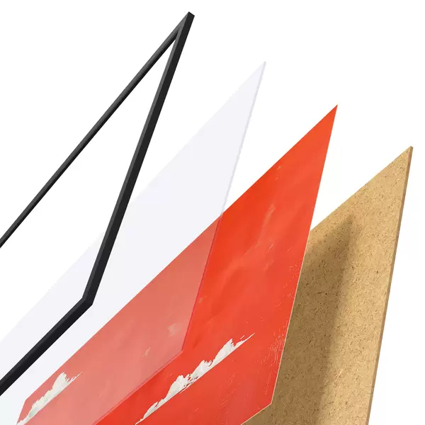 Das Poster besteht aus einem Rahmen, Plexiglas, einem gedruckten Bild und einer Rückwand aus Spanplatten. Dank der Halterungen auf der Rückseite kann das Poster sofort an die Wand gehängt werden.