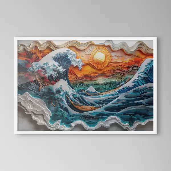 Poster Basrelief-Imitation: ein tosendes Meer mit Booten und Sonne Nr f40976