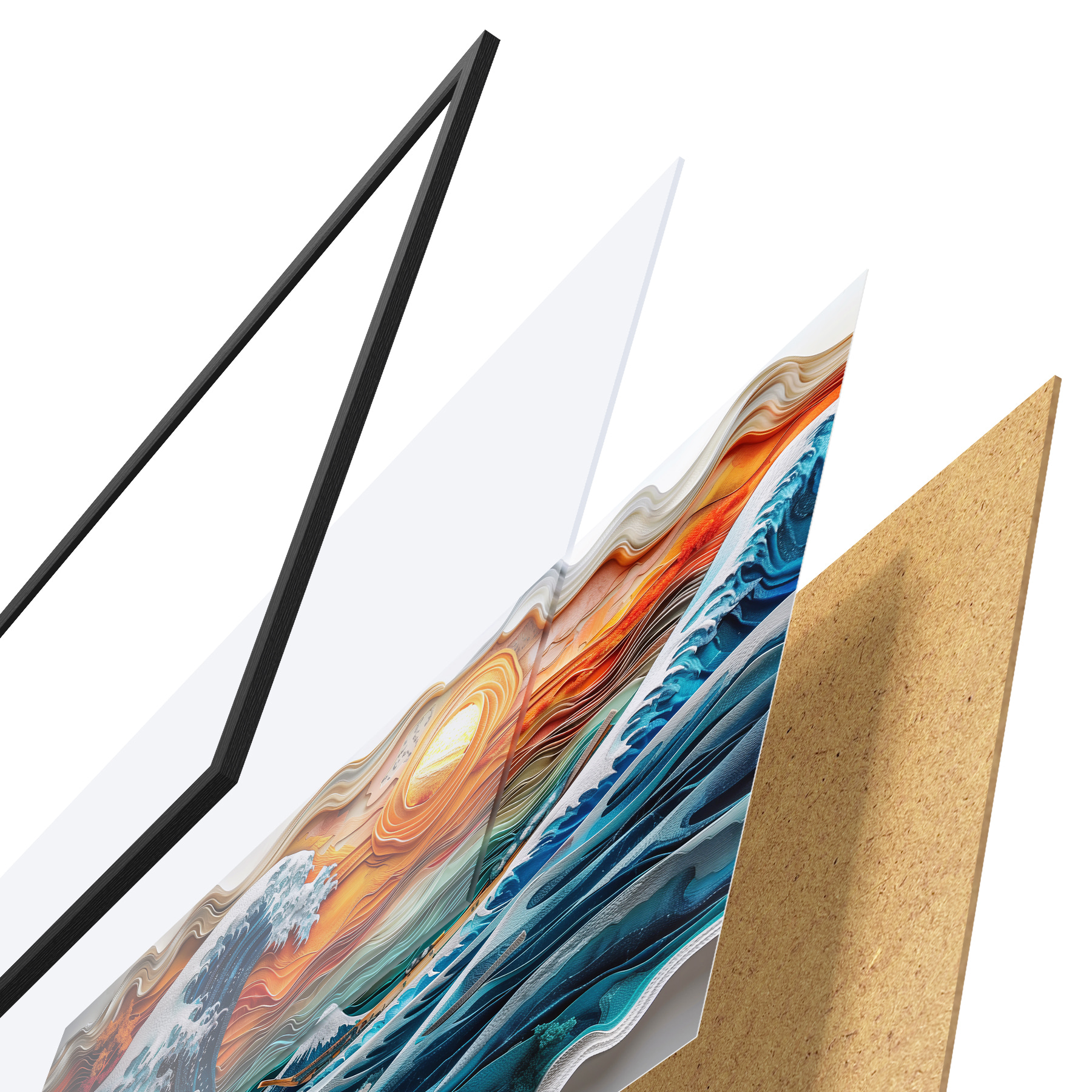 Das Poster besteht aus einem Rahmen, Plexiglas, einem gedruckten Bild und einer Rückwand aus Spanplatten. Dank der Halterungen auf der Rückseite kann das Poster sofort an die Wand gehängt werden.