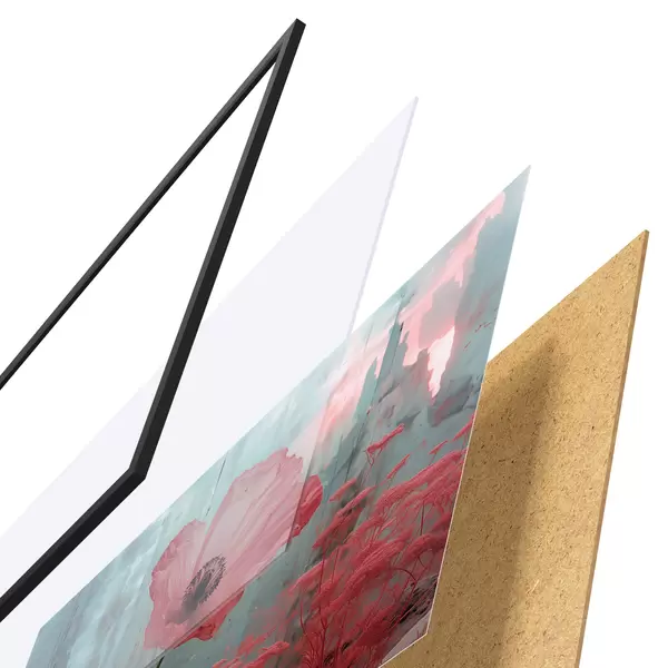 Das Poster besteht aus einem Rahmen, Plexiglas, einem gedruckten Bild und einer Rückwand aus Spanplatten. Dank der Halterungen auf der Rückseite kann das Poster sofort an die Wand gehängt werden.