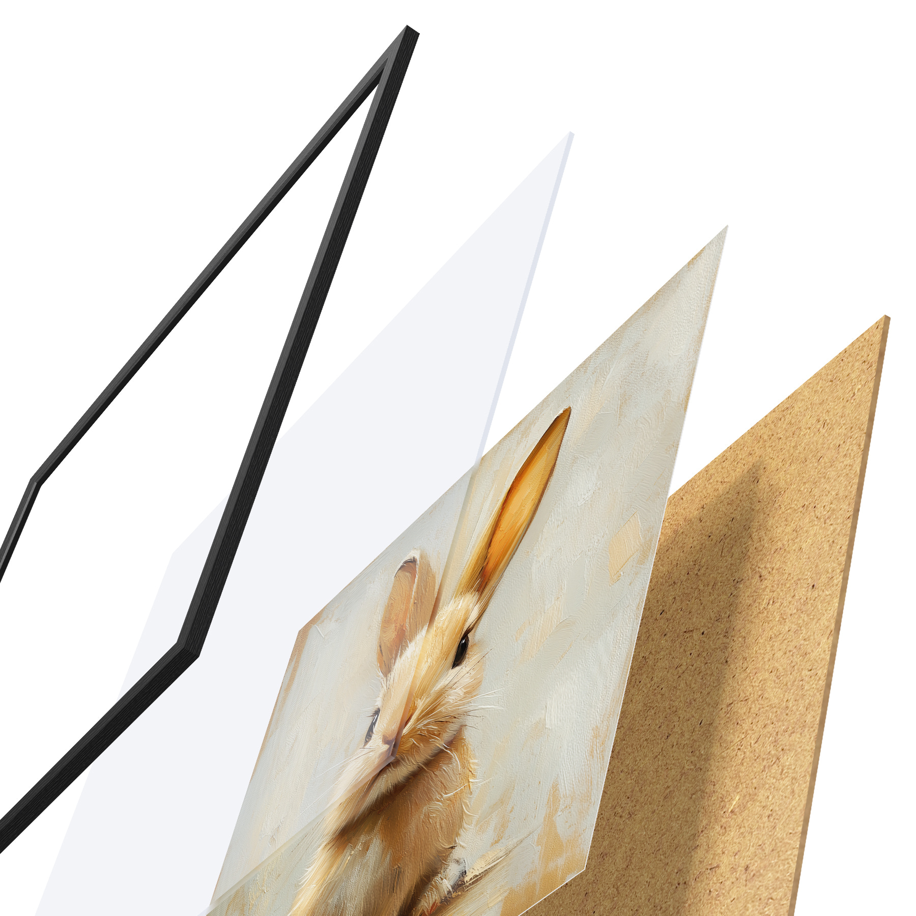 Das Poster besteht aus einem Rahmen, Plexiglas, einem gedruckten Bild und einer Rückwand aus Spanplatten. Dank der Halterungen auf der Rückseite kann das Poster sofort an die Wand gehängt werden.