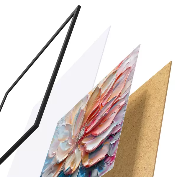 Das Poster besteht aus einem Rahmen, Plexiglas, einem gedruckten Bild und einer Rückwand aus Spanplatten. Dank der Halterungen auf der Rückseite kann das Poster sofort an die Wand gehängt werden.