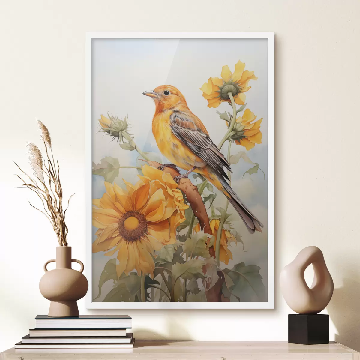 Poster Gelber Vogel auf Sonnenblume sitzend Aquarell Nr f41015