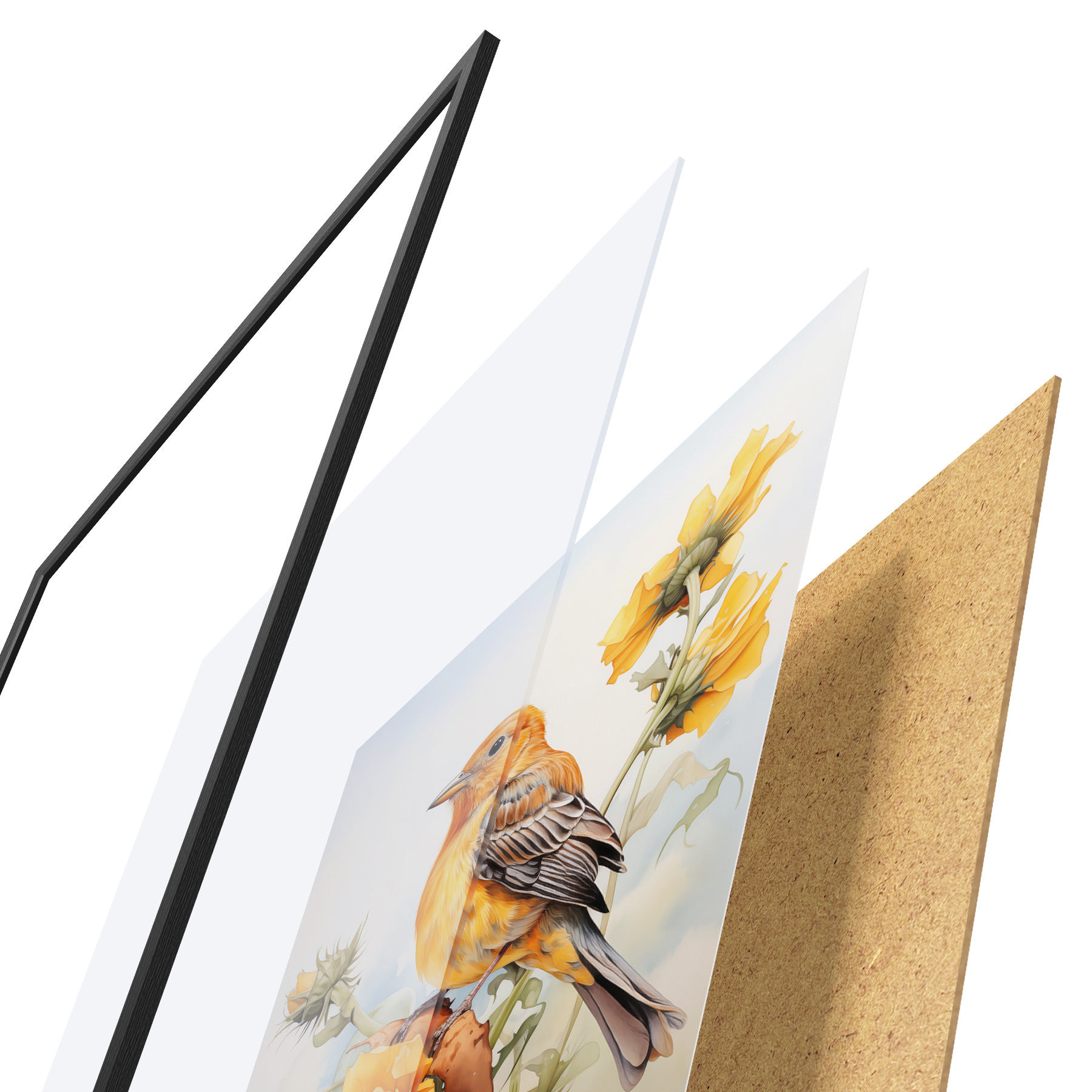 Poster Gelber Vogel auf Sonnenblume sitzend Aquarell f41015
