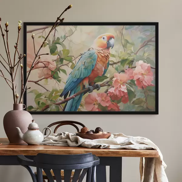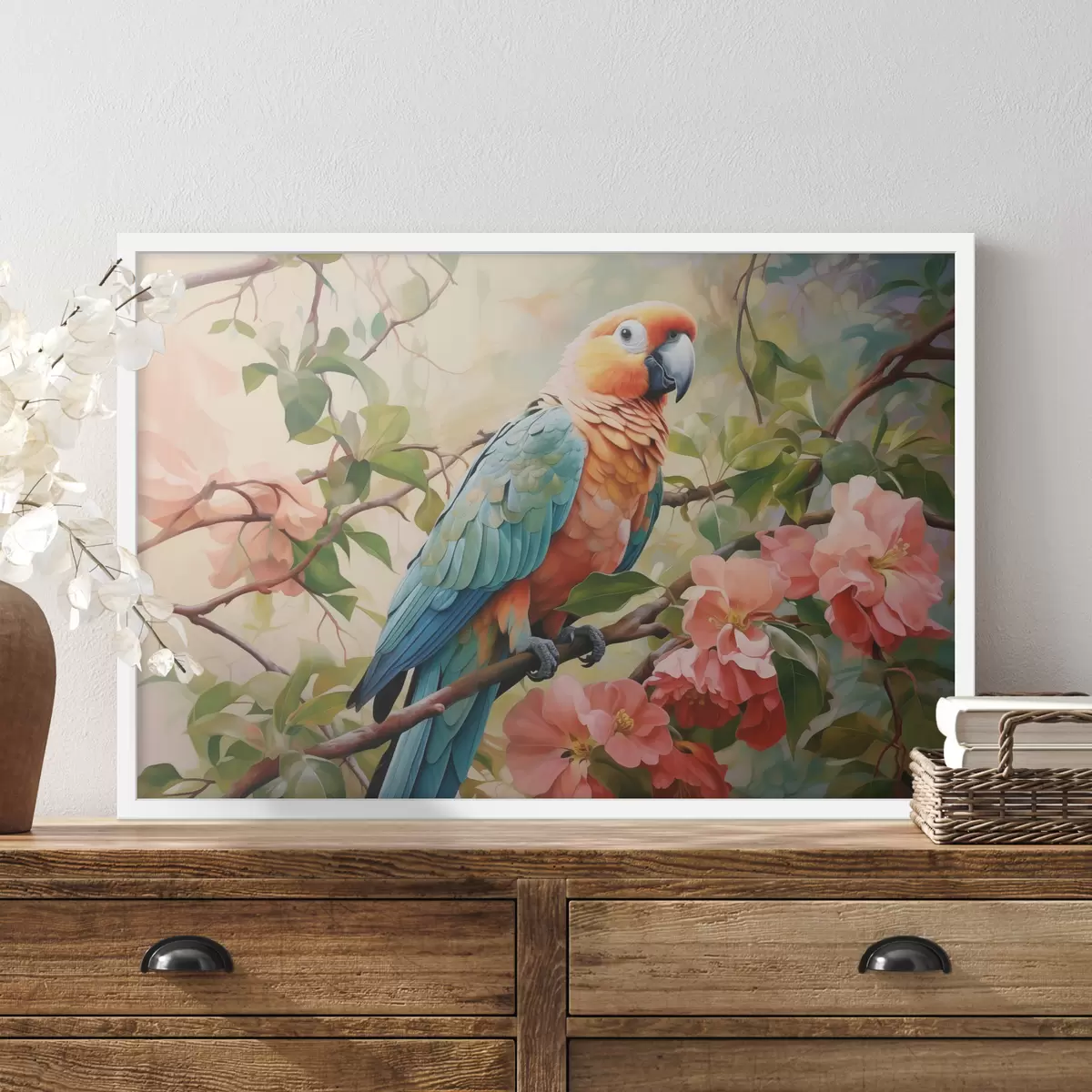 Poster Ara-Papagei sitzt auf einem Zweig mit rosa Blumen Nr f41018