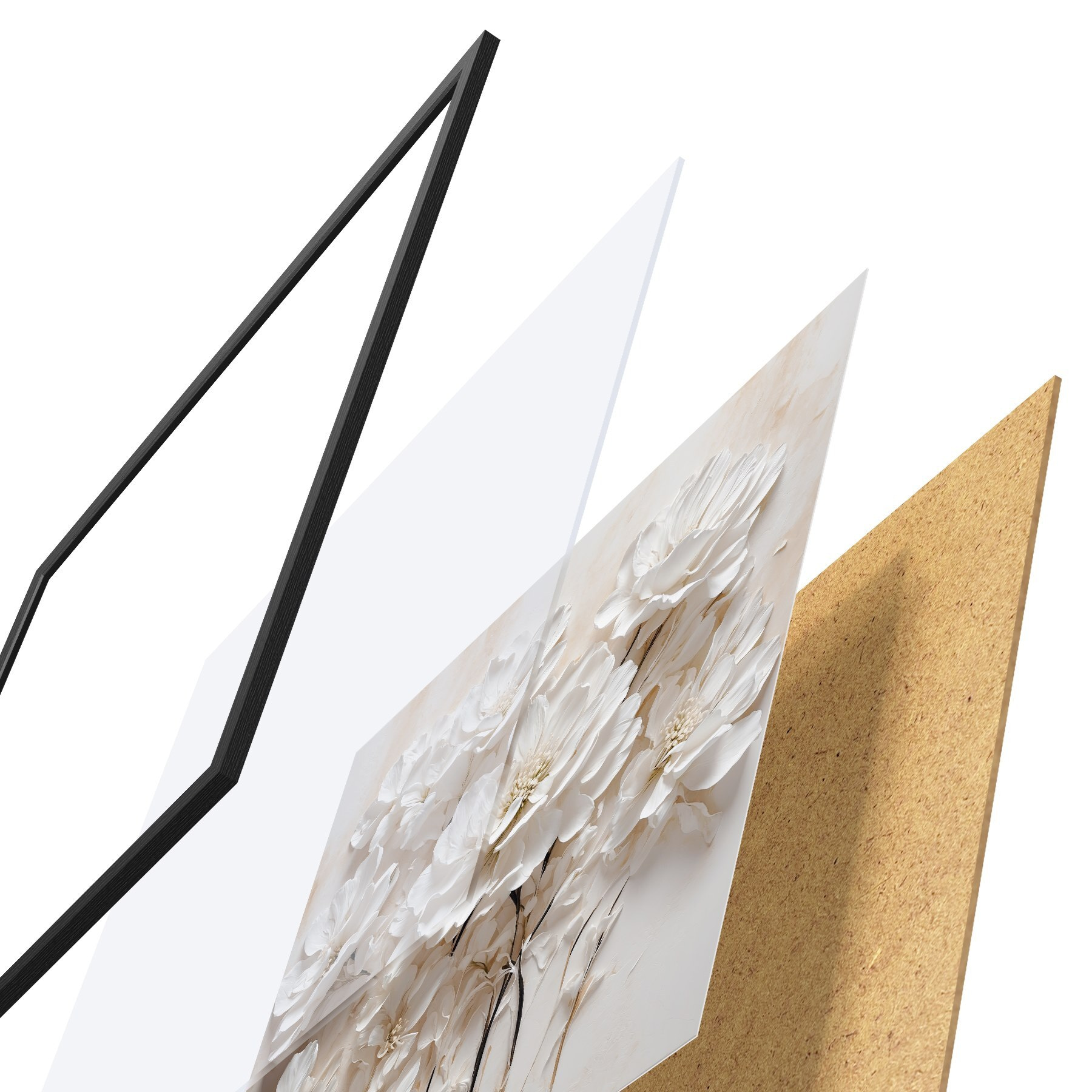 Das Poster besteht aus einem Rahmen, Plexiglas, einem gedruckten Bild und einer Rückwand aus Spanplatten. Dank der Halterungen auf der Rückseite kann das Poster sofort an die Wand gehängt werden.