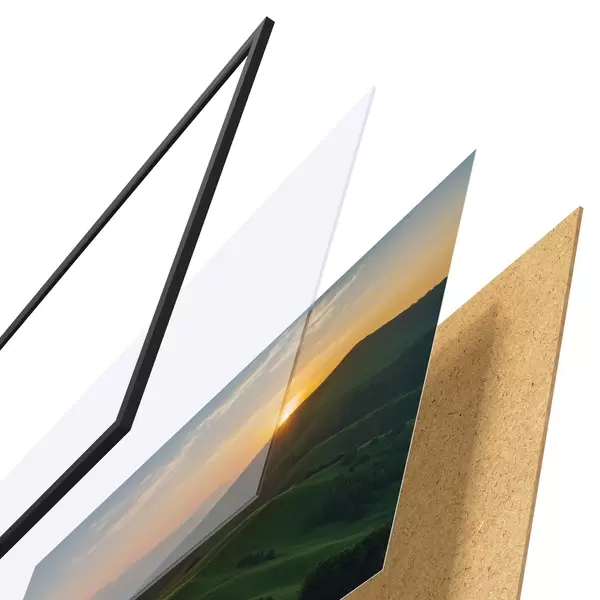 Das Poster besteht aus einem Rahmen, Plexiglas, einem gedruckten Bild und einer Rückwand aus Spanplatten. Dank der Halterungen auf der Rückseite kann das Poster sofort an die Wand gehängt werden.