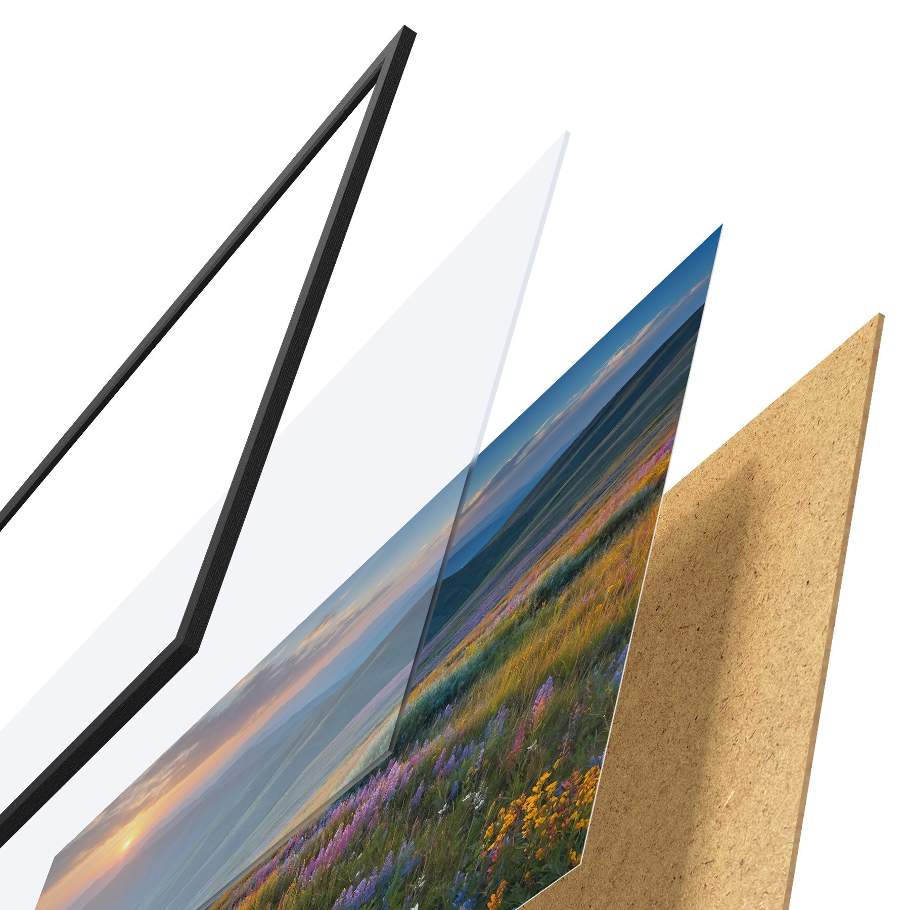 Das Poster besteht aus einem Rahmen, Plexiglas, einem gedruckten Bild und einer Rückwand aus Spanplatten. Dank der Halterungen auf der Rückseite kann das Poster sofort an die Wand gehängt werden.