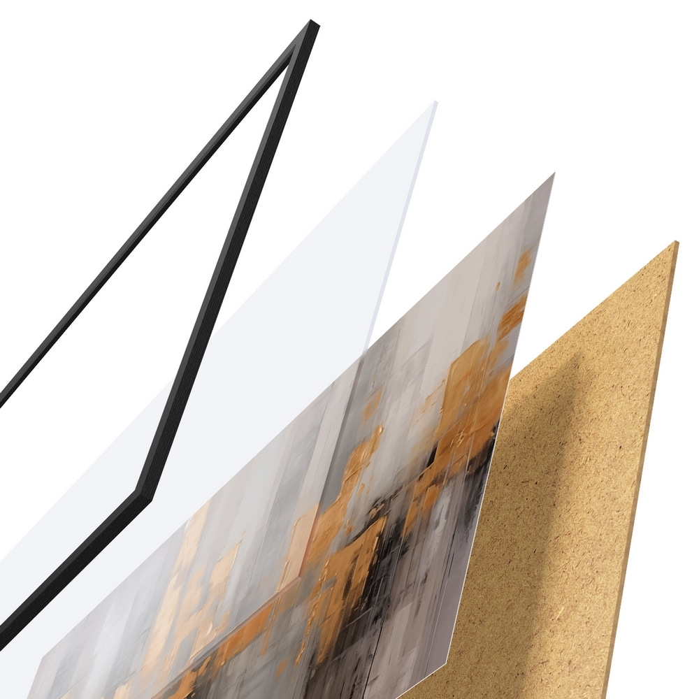 Das Poster besteht aus einem Rahmen, Plexiglas, einem gedruckten Bild und einer Rückwand aus Spanplatten. Dank der Halterungen auf der Rückseite kann das Poster sofort an die Wand gehängt werden.