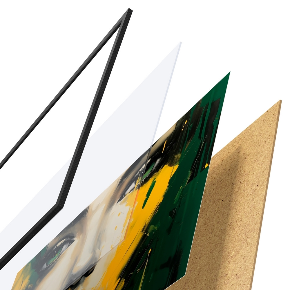 Das Poster besteht aus einem Rahmen, Plexiglas, einem gedruckten Bild und einer Rückwand aus Spanplatten. Dank der Halterungen auf der Rückseite kann das Poster sofort an die Wand gehängt werden.