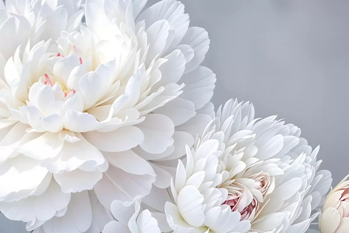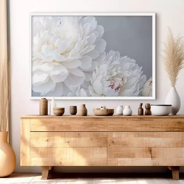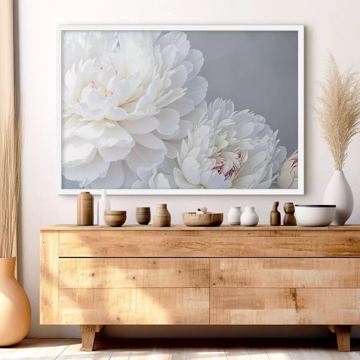Poster Weiße Pfingstrosenblüten mit weichen, zarten Blütenblättern vor hellgrauem Hintergrund Nr f41085