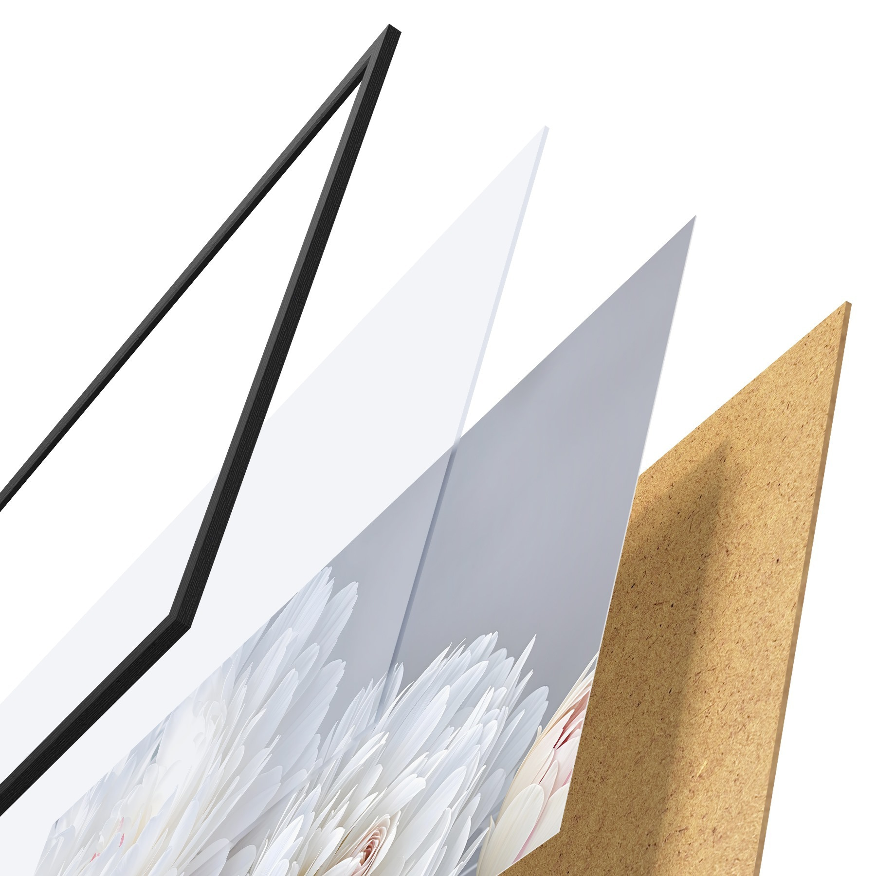 Das Poster besteht aus einem Rahmen, Plexiglas, einem gedruckten Bild und einer Rückwand aus Spanplatten. Dank der Halterungen auf der Rückseite kann das Poster sofort an die Wand gehängt werden.