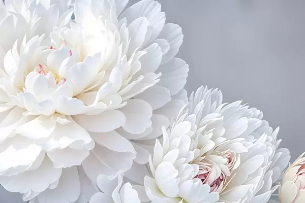 Poster Weiße Pfingstrosenblüten mit weichen, zarten Blütenblättern vor hellgrauem Hintergrund Nr f41085