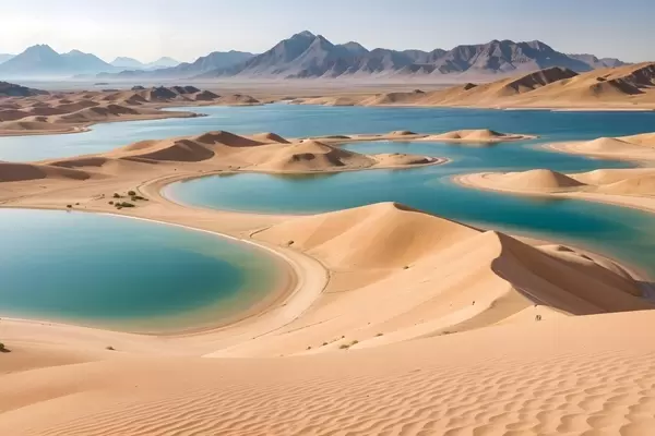 Poster Eine weite Wüstenlandschaft mit sanften Sanddünen und türkisfarbenen Seen, umgeben von schroffen Bergen Nr f41087