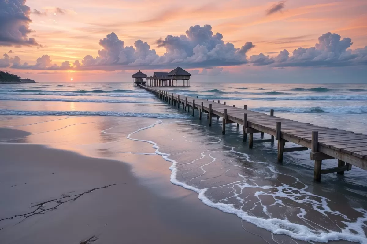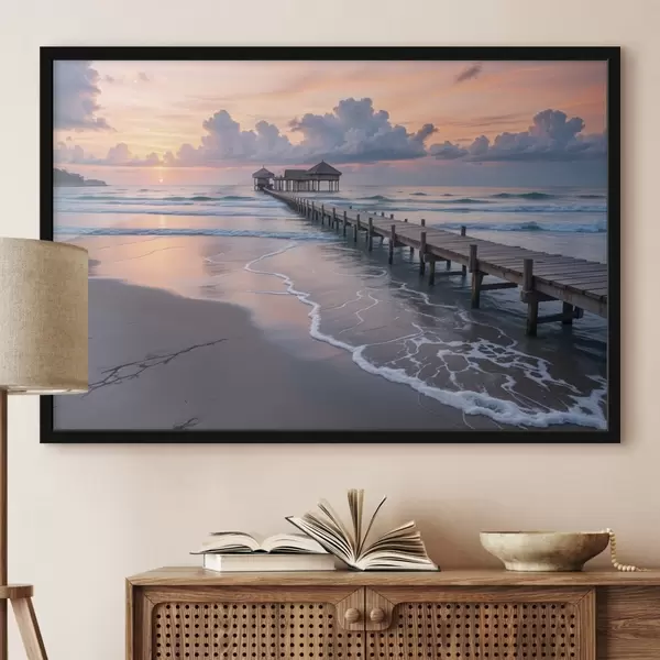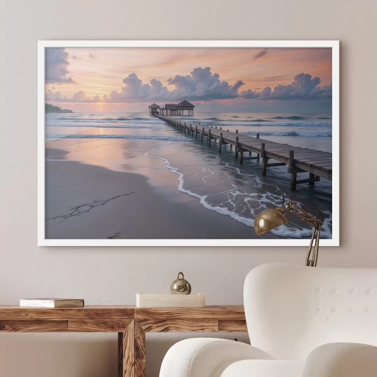 Poster Ein hölzerner Steg, der in einen ruhigen Ozean bei Sonnenuntergang mit bunten Wolken hineinragt Nr f41091